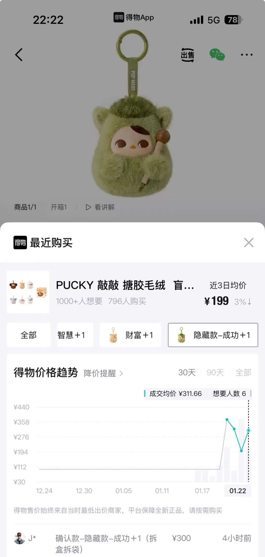 目前,泡泡玛特官网小程序显示已售罄。记者查看得物App发现,该系列发售之初,隐藏款“成功”市场成交价由99元上涨至396元,溢价3倍。常规款中,销量最高的是“智慧”,该产品市场成交价由99元上涨至209元,溢价1倍。