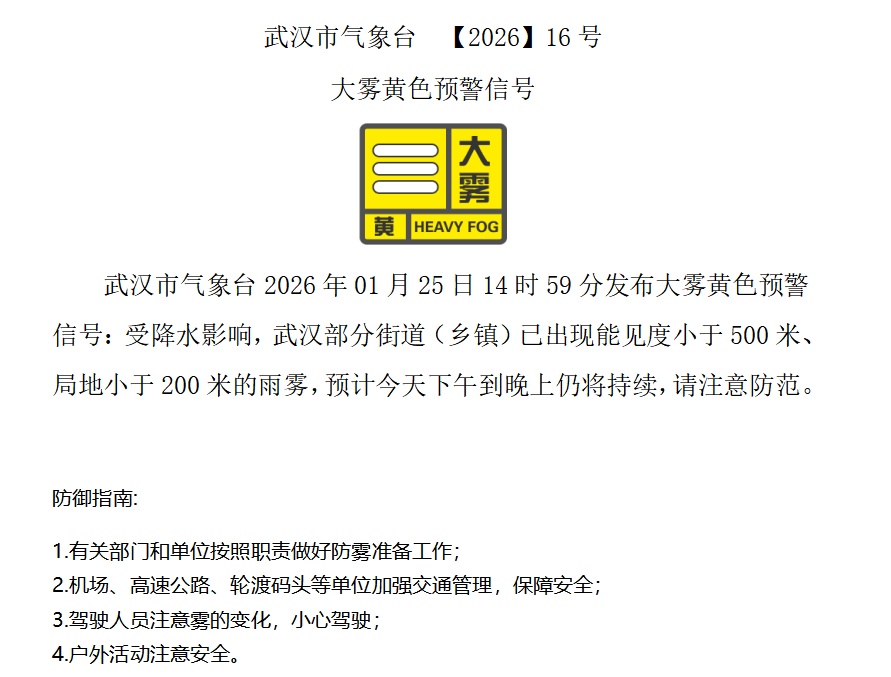武汉发布大雾黄色预警:部分街道能见度小于500米