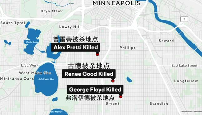 根据消息方发布的示意图,普雷蒂被枪杀的地点位于古德被枪杀地点的西北方向,两地相距仅几公里。此外,消息指出,这两处地点均在2020年弗洛伊德案事发地的附近。据此前报道,古德被杀的地点距离弗洛伊德被杀的地点仅约1.6公里。