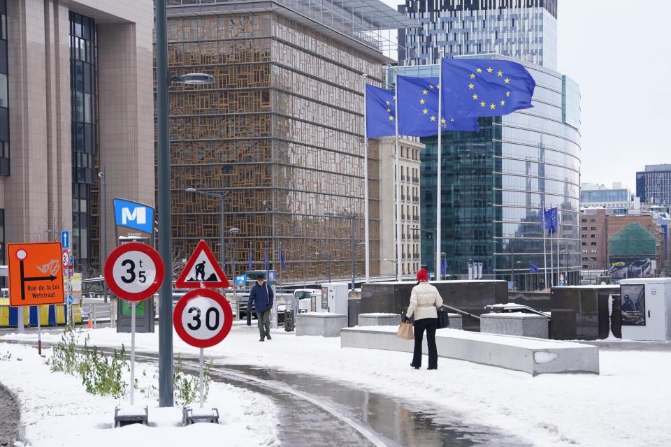 1月7日,在比利时布鲁塞尔,市民在雪中步行。新华社记者彭子洋摄