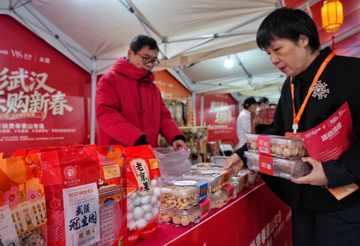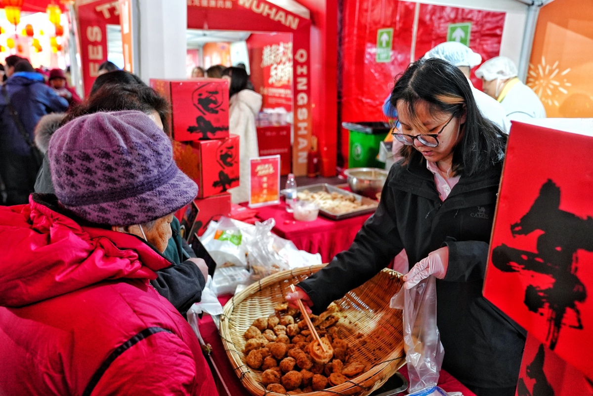 活动现场的新春市集人气爆棚,精心布局了武汉“十大名菜、十大名点、十大伴手礼”专区、老字号专区、青山特色专区及武商专区,实现本土风味与新春氛围的深度融合。冠生园老发饼、江夏风干桂鱼、黄陂三鲜、蔡甸藕汤、汪集鸡汤、红烧黄陵得胜圆子等武汉特色美食悉数亮相,现场同步提供试吃体验,让市民近距离品尝江城风味;“江夏红”红茶、新农牛肉礼盒、杨楼子湾麻油、星彤非遗手工皮蛋咸鸭蛋礼盒等优质伴手礼集中陈列,全方位呈现武汉饮食文化的独特魅力,满足市民年货置办、风味品尝、特产选购等一站式需求。