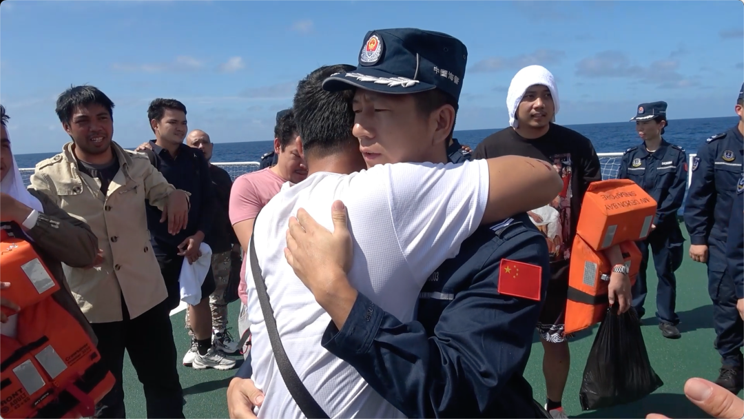 被救船员与中国海警拥抱道别,并诚恳致谢:“非常感谢中国海警!”