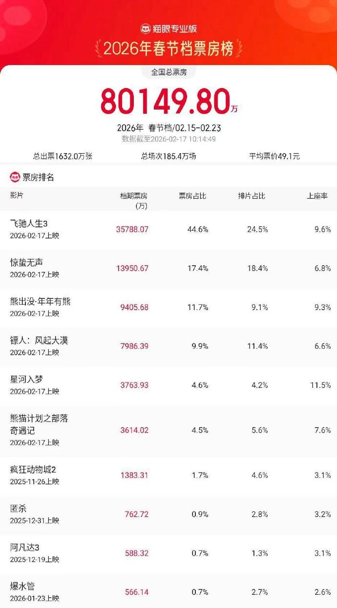 据猫眼专业版数据,2026年春节档档期总票房破8亿,《飞驰人生3》持续领跑。
