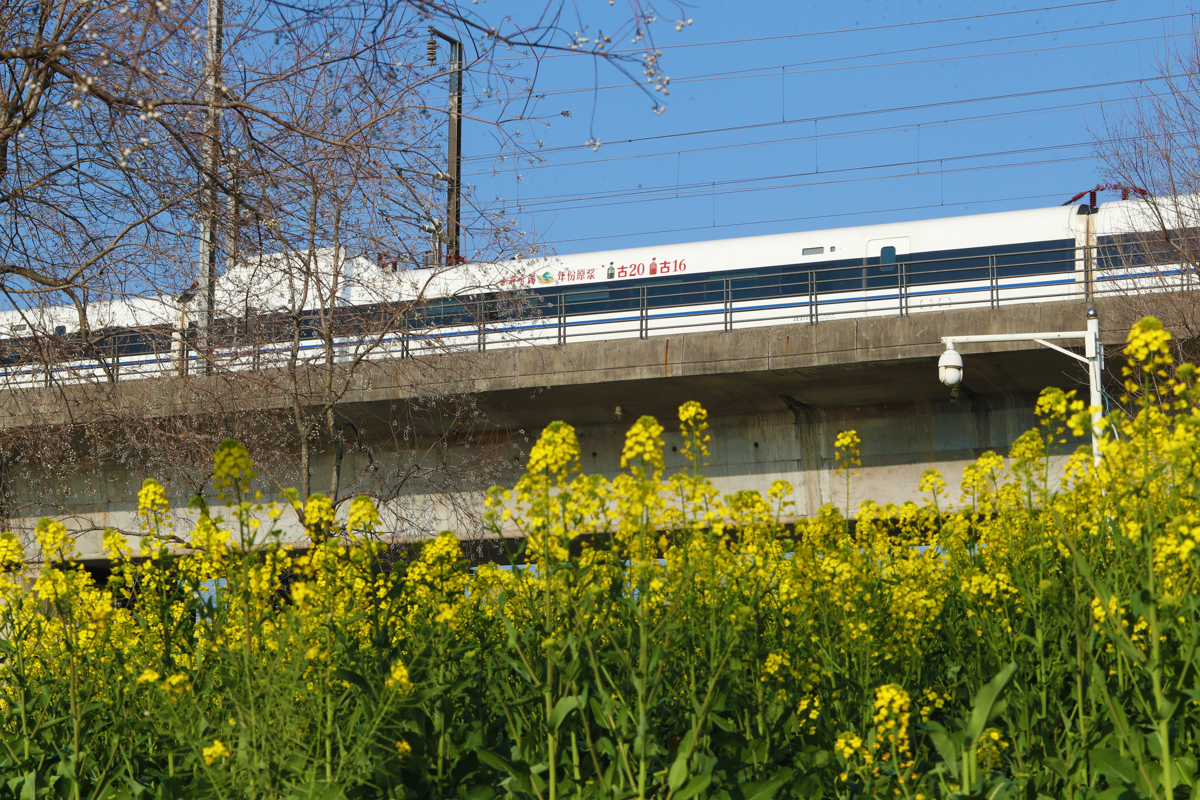 洪山区杨春湖公园的油菜花与高铁同框