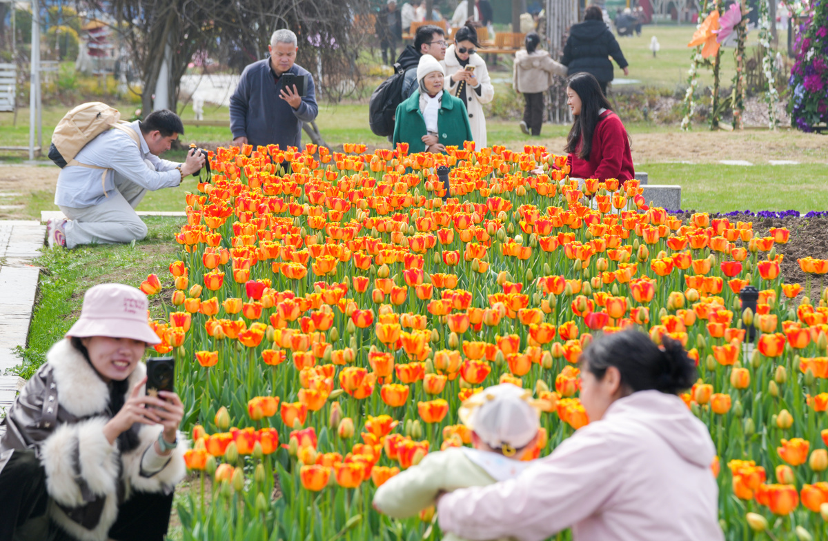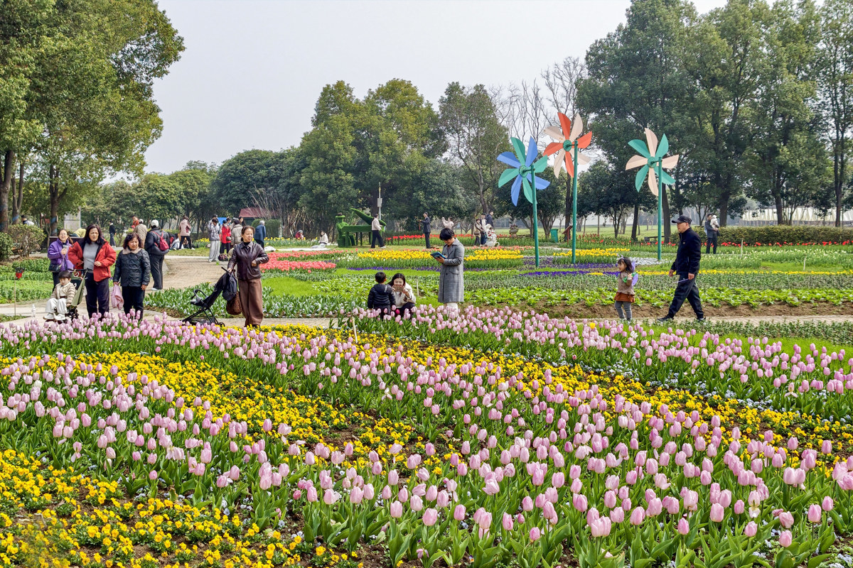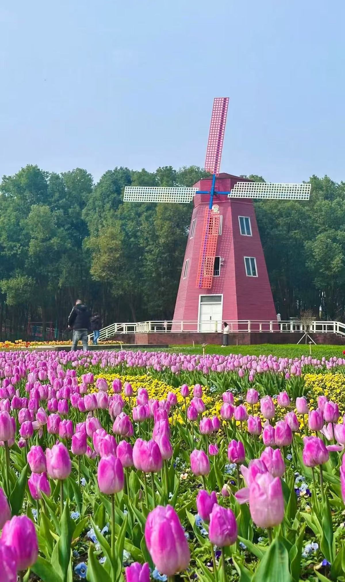 位于武汉市东西湖区柏泉街的武汉农业集团东西湖郁金香主题公园内色彩斑斓、花香四溢,诚邀八方来客共赴这场春日之约。据介绍本次花展将持续至5月10日,随着气温逐渐回暖,预计3月14日至4月6日将迎来最佳观赏期,届时园内近60万株郁金香将竞相绽放,呈现最绚烂的春日画卷。欧洲风情广场成为游客打卡热点。大红色的大朵郁金香格外引人注目,与远处的风车、蓝天白云相映成趣,宛如一幅浓墨重彩的油画。粉紫、明黄、暖橙等各色郁金香错落有致,微风拂过,摇曳生姿。