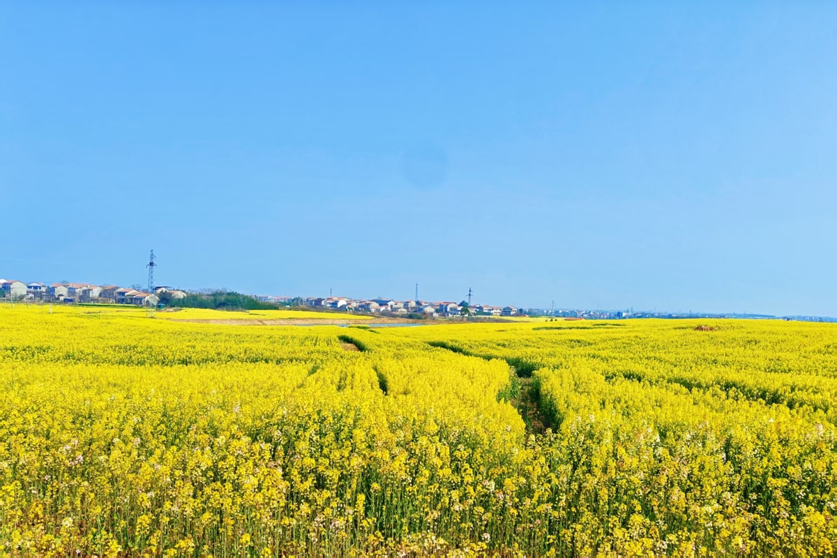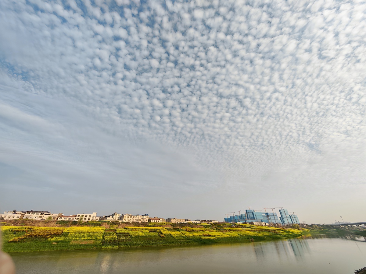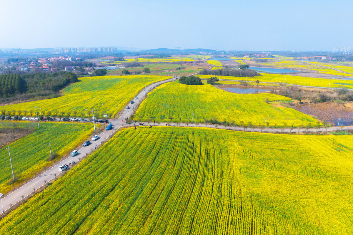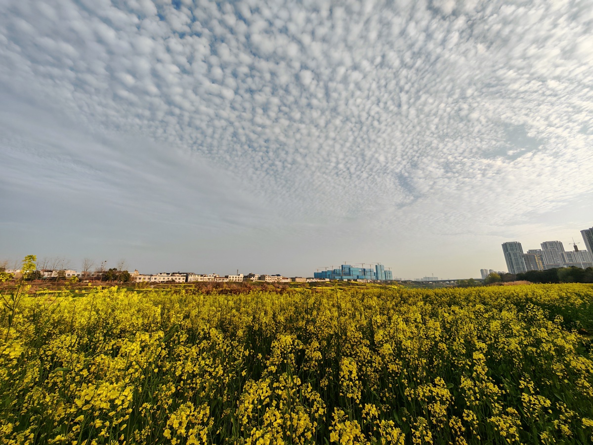 武汉长江新区朱家河,被漫天碎云温柔笼罩。油菜花田顺着河岸绵延数公里,铺成一片流动的金色海洋,与澄澈的河水相映成趣。风过处,花浪轻摇,细碎的阳光在花瓣上跳跃,清甜的香气漫过堤岸,裹着河水的湿润气息。远处,老房与新楼错落而立,塔吊勾勒着城市生长的轮廓,让这片“武汉的婺源”在乡野诗意与都市脉搏间,晕染出独有的生机。