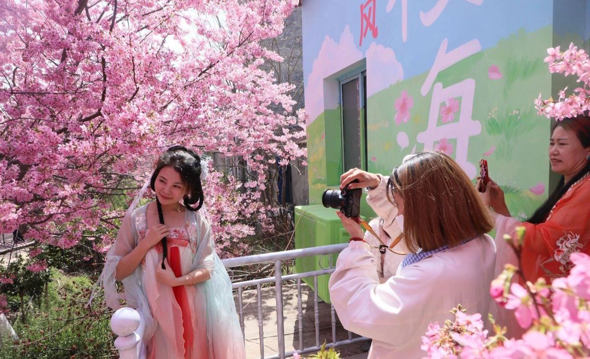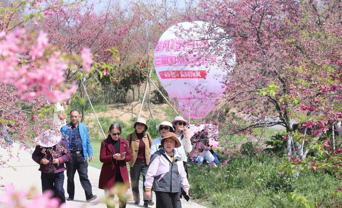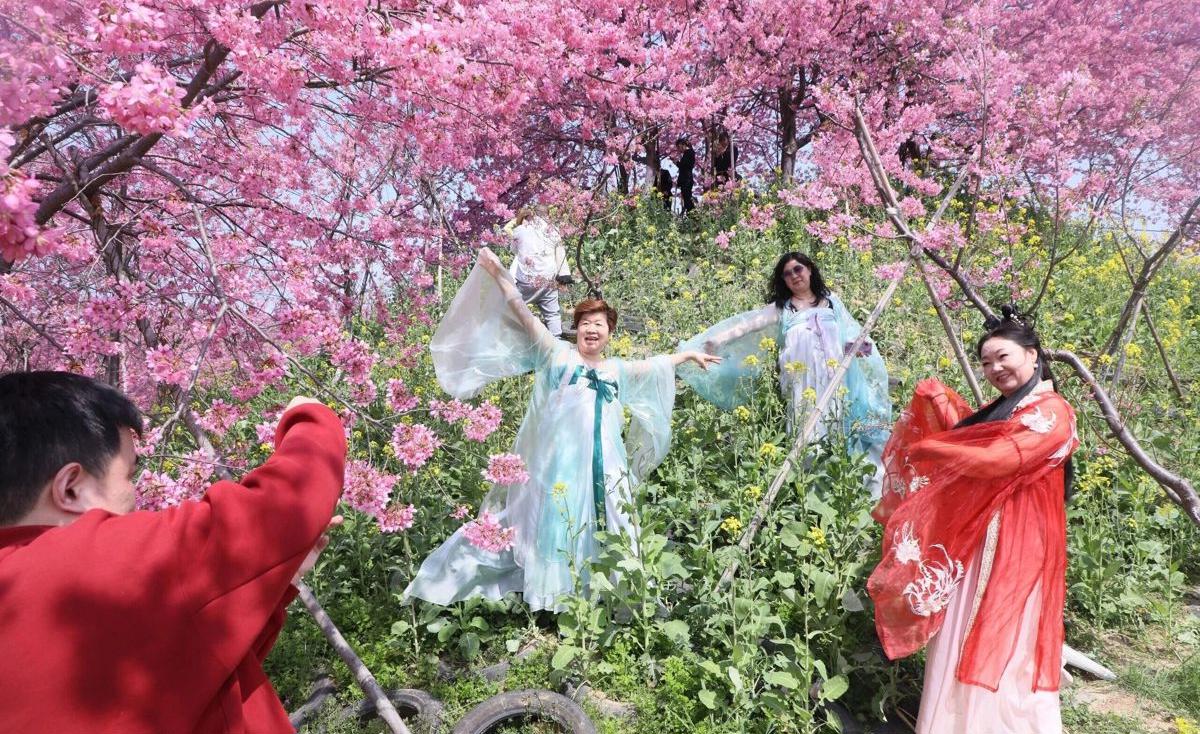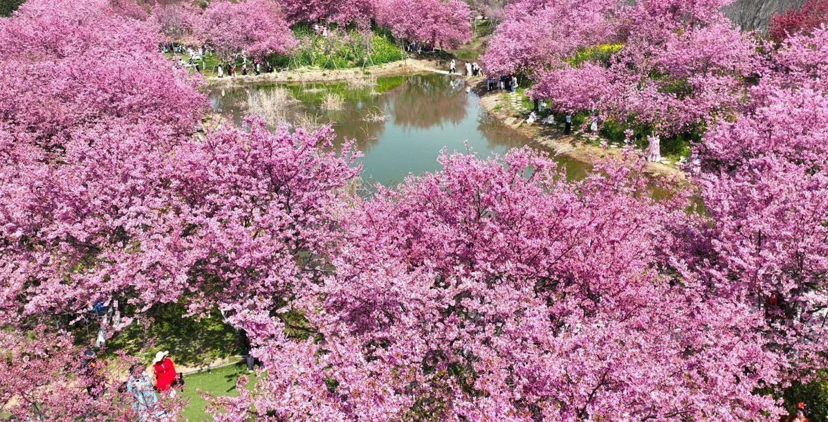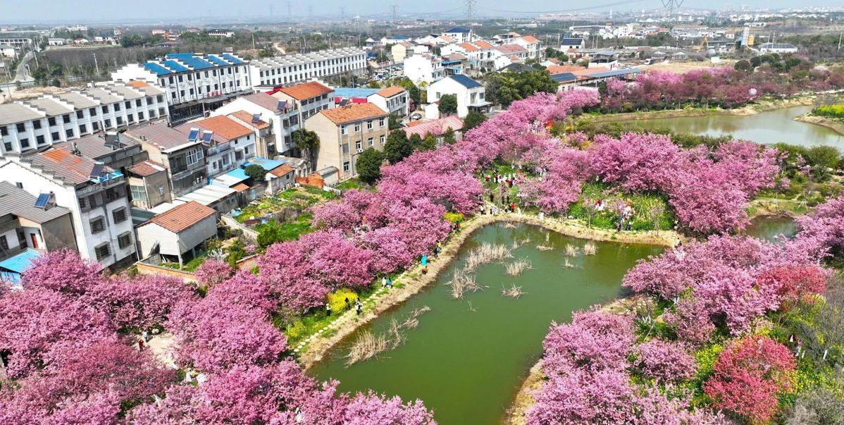 长江新区仓埠街道周铺村楚风樱海生态园迎来烂漫春光。园内游人如织,白樱似雪,簇簇绽放;粉樱如云,绯红明媚。晴日当空,漫天花瓣轻舞飞扬,将整片天空晕染成温柔的粉色薄纱,一步一景皆是醉人的春日盛景。