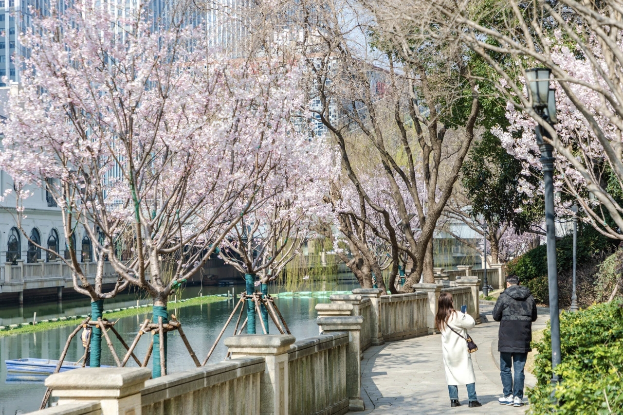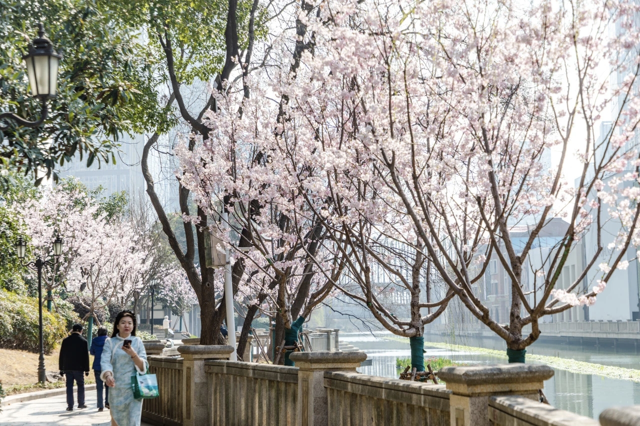 行人漫步于亲水步道,或驻足举起手机记录花开瞬间,微风拂过,花瓣轻摇,清甜香气漫在空气里,让繁华都市也有了可栖居的自然诗意。