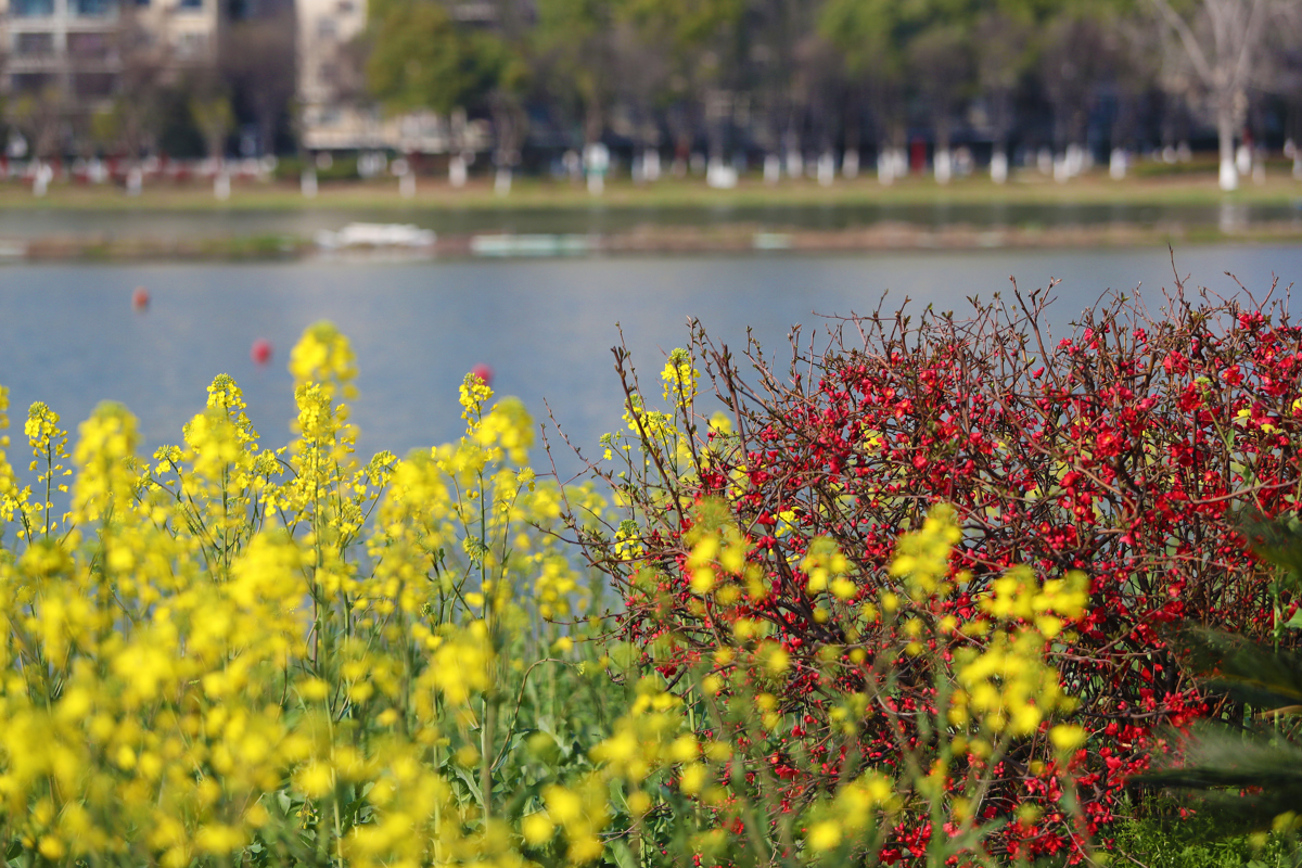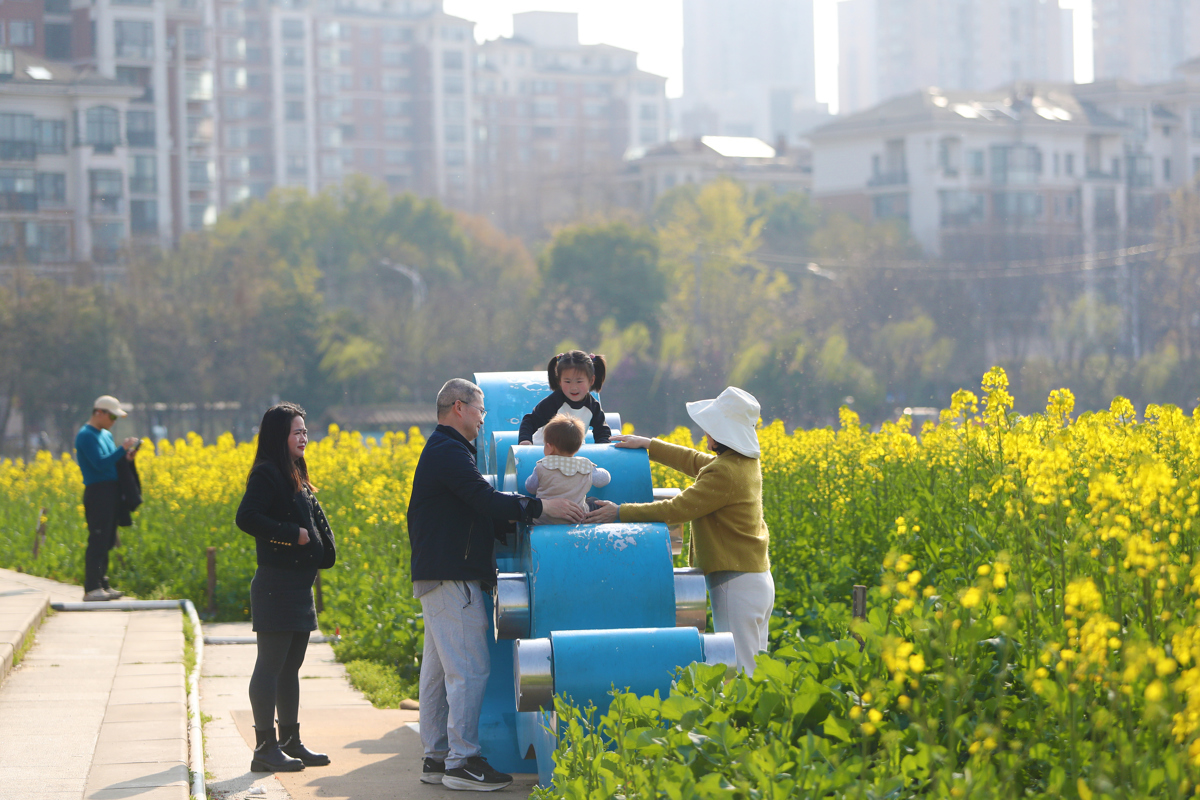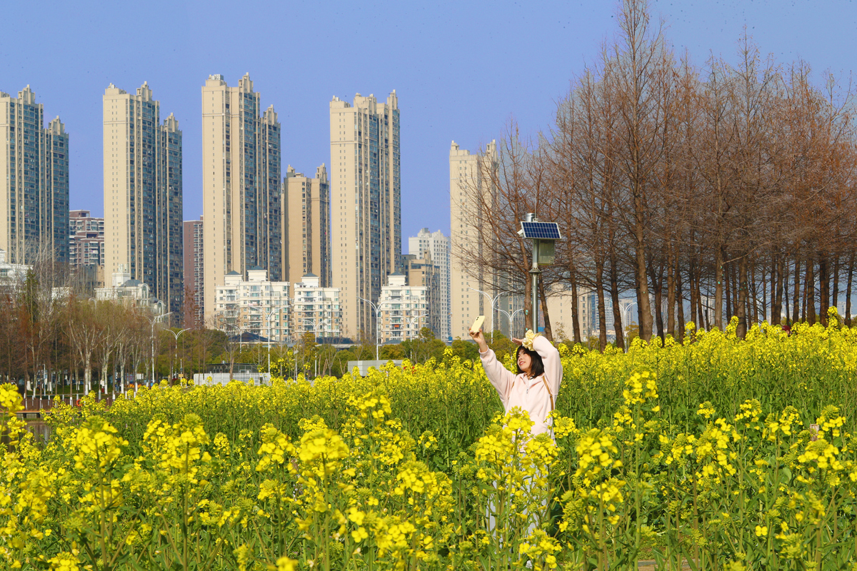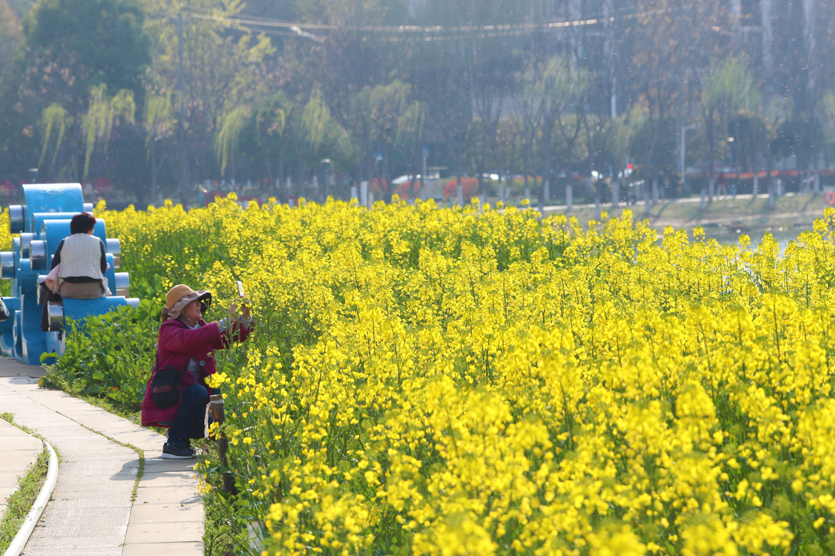 洪山区南湖幸福湾公园东侧,3000多平方米的油菜花田已展露风姿。金色的花海与波光粼粼的南湖交相辉映,微风拂过,花浪此起彼伏,清甜花香沁人心脾。
