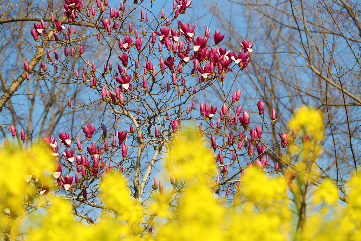 洪山区杨春湖公园,油菜花和玉兰花同框