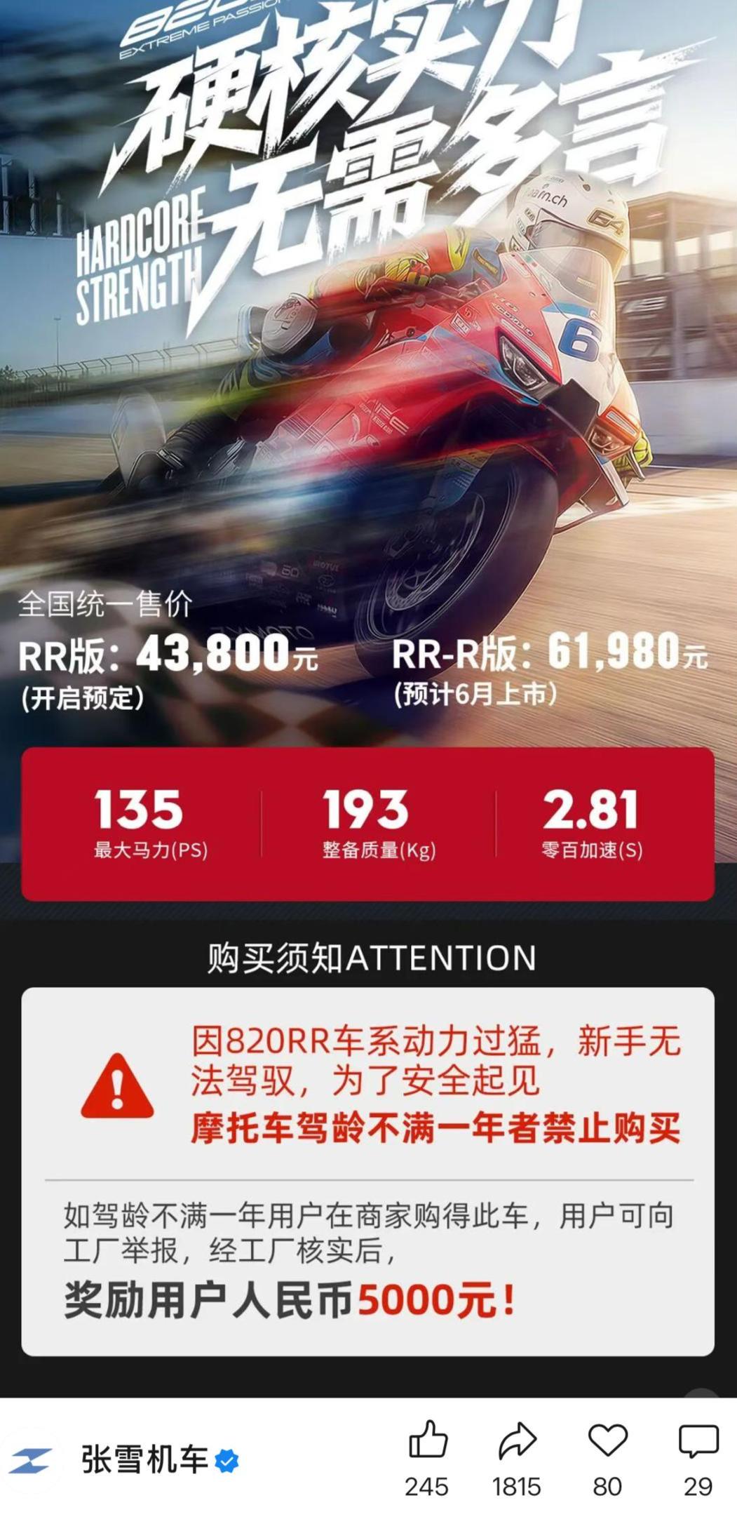 3月21日,张雪机车仿赛车型820rr对外预定,该车型最大马力135匹,整备质量193公斤,零百加速2.81秒,价格为43800元至61980元。预定海报上显示,因820RR车系动力过猛,新手无法驾驭,为了安全起见,摩托车驾龄不满一年者禁止购买该车。如驾龄不满一年用户在商家购得此车,用户可向工厂举报,经工厂核实后,奖励用户5000元。