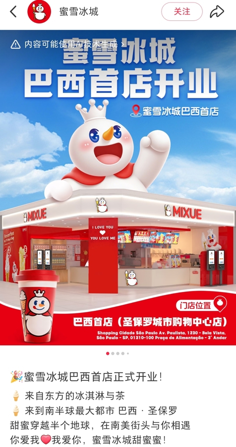 记者注意到,蜜雪冰城12日上午发布消息“蜜雪冰城巴西首店开业”,来自东方的冰淇淋与茶来到南半球最大都市巴西圣保罗,甜蜜穿越半个地球,在南美街头与你相遇。