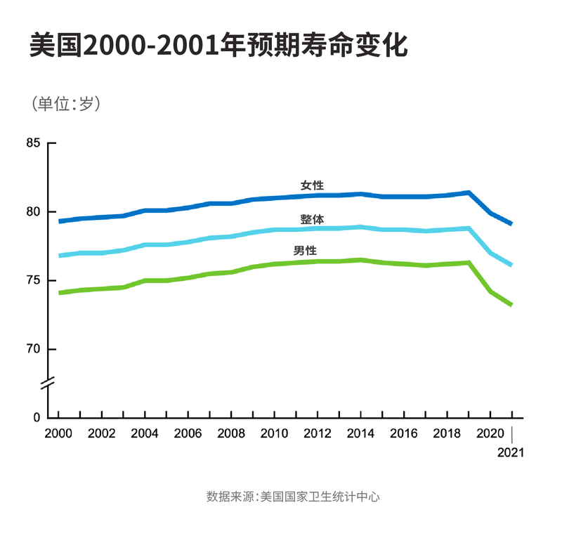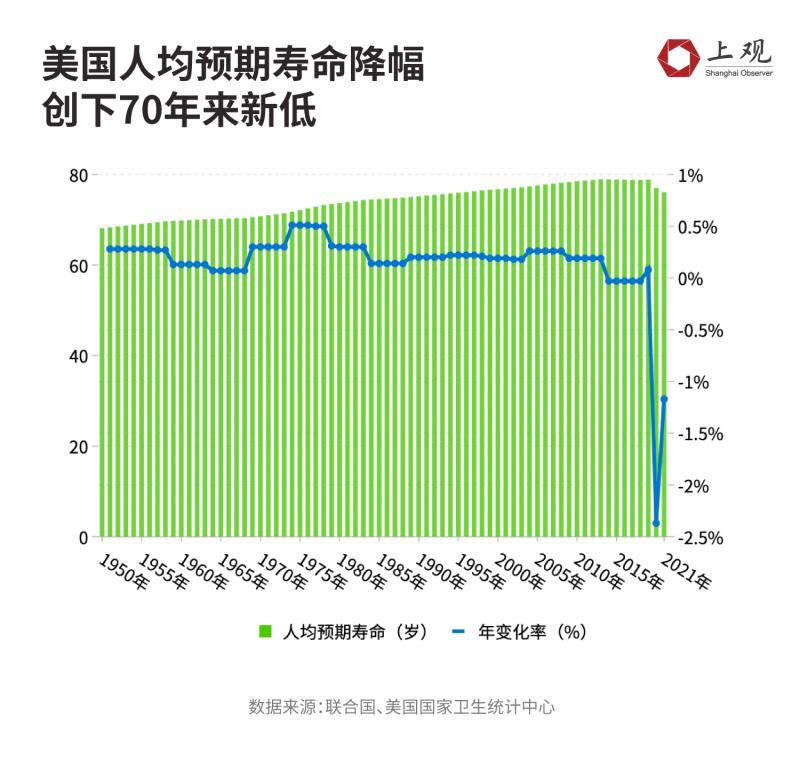 美国人均预期寿命连续两年的降幅达到2.7岁,下降幅度创下二战以来的纪录,目前的人均预期寿命退回到1996年的水平。