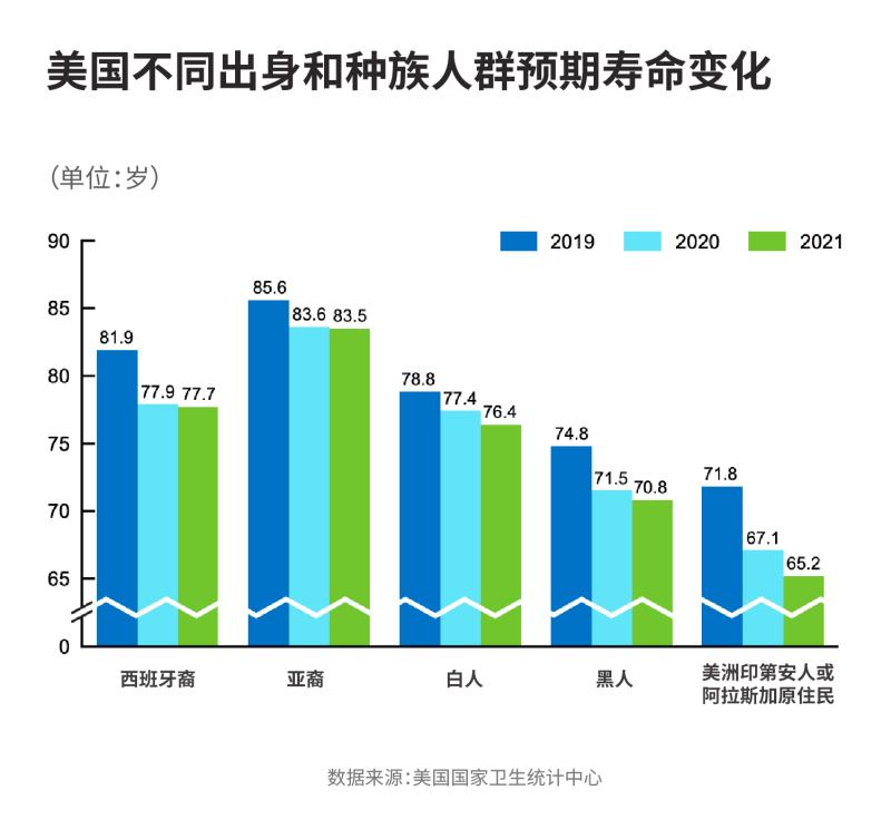 美国不同出身和种族群体的人均预期寿命也存在较大差异。