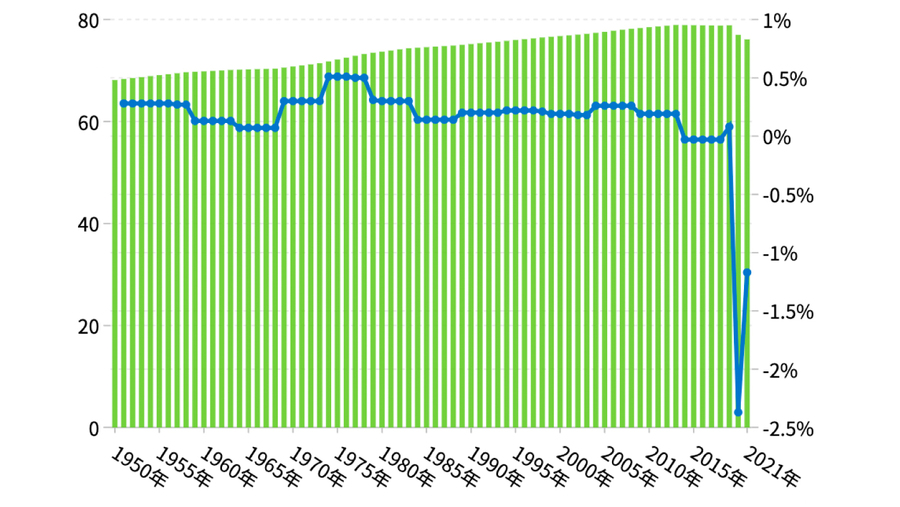 1950年-2019年,美国的人均预期寿命一直处于逐步上升趋势,2000-2019年的平均年增长为0.15%,直到2020年和2021年人均预期寿命陡然下滑,出现-2%和-1%的年变化率。