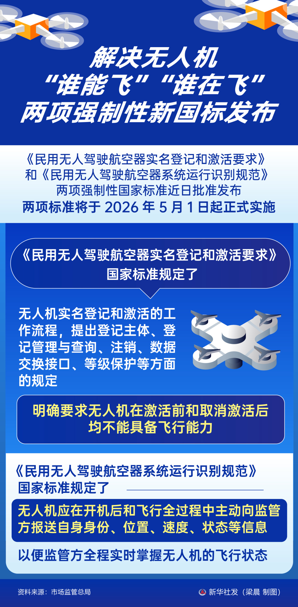 记者12月9日从市场监管总局获悉,《民用无人驾驶航空器实名登记和激活要求》和《民用无人驾驶航空器系统运行识别规范》两项强制性国家标准近日批准发布,两项标准将于2026年5月1日起正式实施。