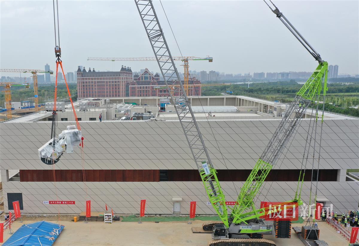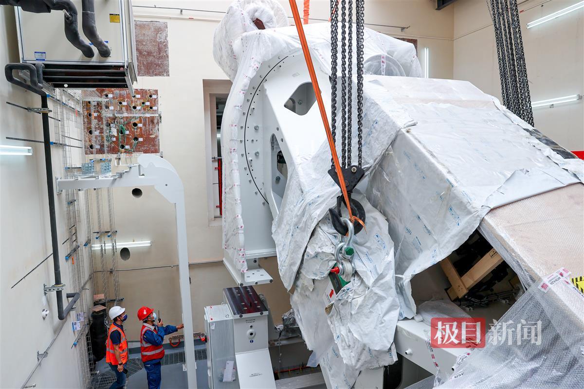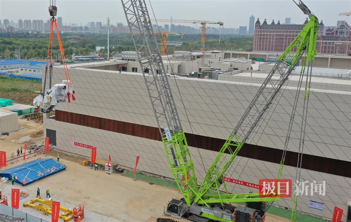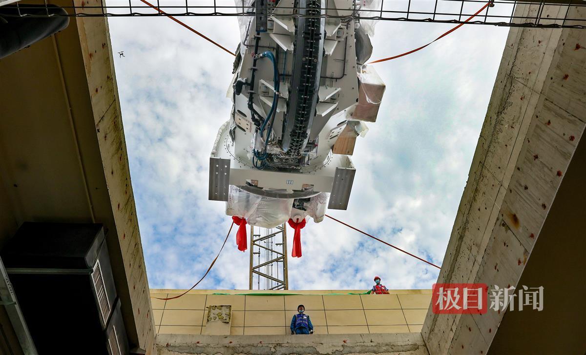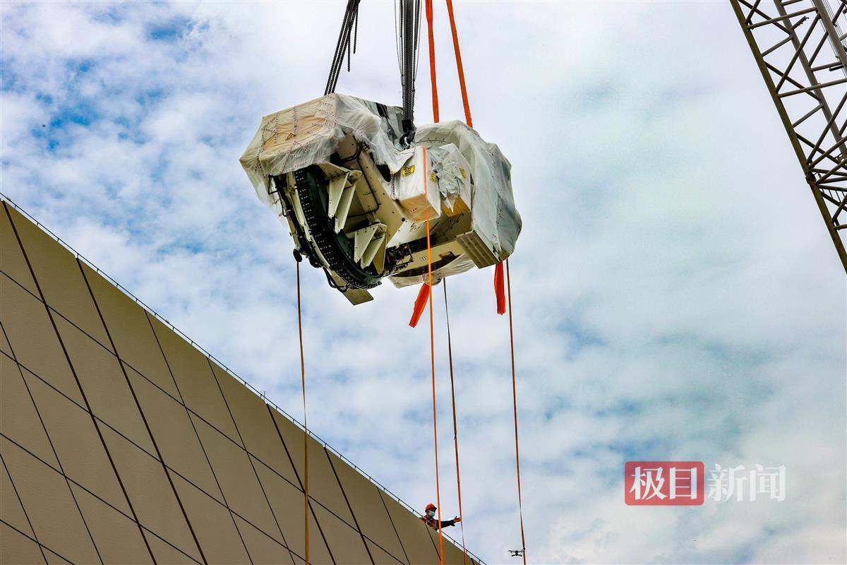 上午9时45分,随着一声令下,一台10层楼高的起重机启动,缓缓将旋转机架吊起,在40米的高空调整好角度、位置后,对准房顶预留的“临时入口”,稳稳下降。全程30分钟,在场所有人的目光都聚焦在它身上。