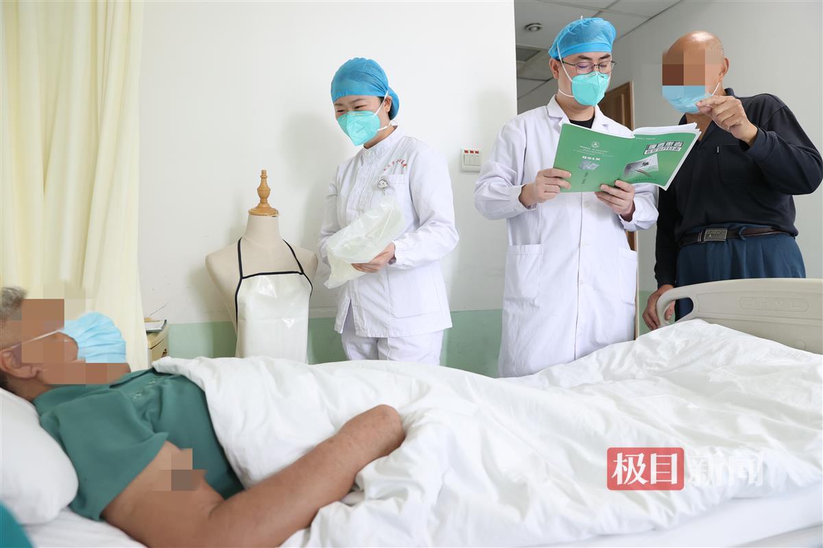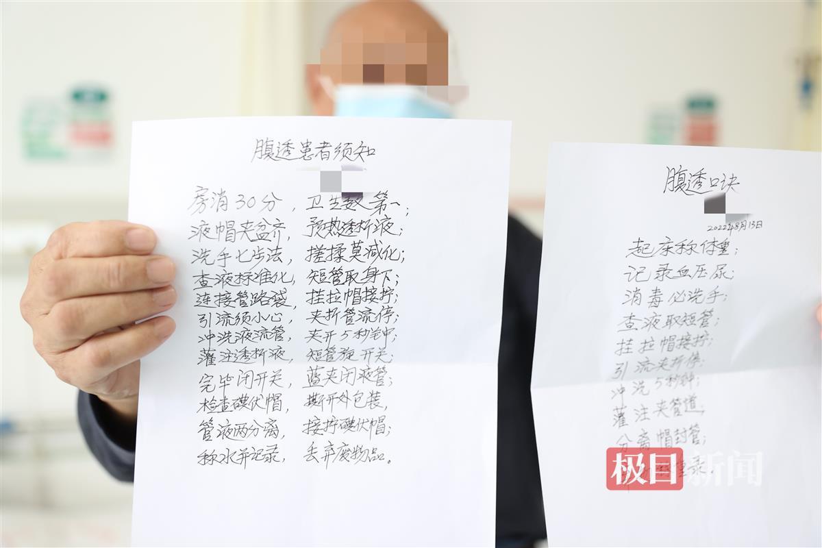 尿毒症老人在武汉市中心医院后湖院区肾病内科接受腹膜透析导管置入术后,管床医生汪雄攀和护士舒昕捷不但悉心照顾,还耐心指导家属如何安全有效进行居家腹膜透析。患者的老伴根据汪雄攀和舒昕捷的指导还专门编写出“腹透口诀”,在方便自己的同时,帮助了不少有同样需求的病友及家属。