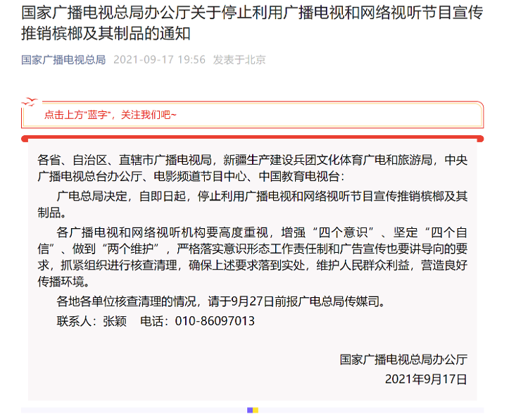 2021年9月17日,国家广播电视总局办公厅也发布了通知,要求停止利用广播电视和网络视听节目宣传推销槟榔及其制品。