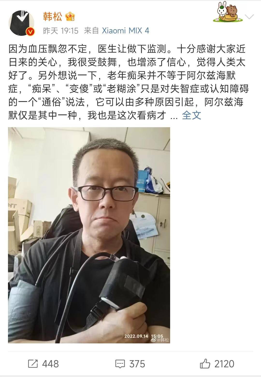 注意到以上留言,韩松特意发布微博回应网友的关心:“十分感谢大家,我很受鼓舞,也增添了信心,觉得人类太好了。”