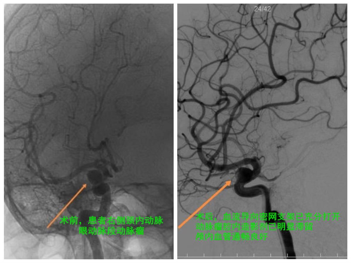 经过周密的术前准备,肖国民带领神经介入团队在不到一小时的精心操作下,便顺利完成了手术。术后即刻复查造影显示血流导向密网支架已充分打开,各段均贴壁良好,动脉瘤腔内造影剂已明显滞留,颅内血管通畅良好。次日徐女士即可下床活动,头痛明显缓解,超前解决了颅内隐忧。