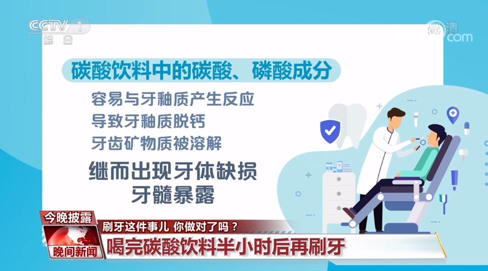 北京安贞医院口腔科主任刘林:喝完碳酸饮料以后,这时候牙齿表面有部分的这个脱矿,这时候不建议你马上刷牙,可以喝一些白开水或稀释和中和表面的这种酸性物质,大概过个半小时左右,然后我们再刷牙。