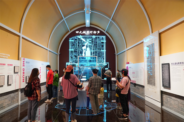 鼓楼7个券洞呈“丰”字形分布,高约11.5米的中心券洞横贯东西,南北两侧各分列3个券洞。置身于鼓楼之中,各券洞相互连通,明亮宽敞。“序厅”“北京时间”“时间建筑”“中国时间”“我的时间”“发现中轴线”六个主题展厅以及中心券洞沉浸影厅吸引着游客驻足参观体验。