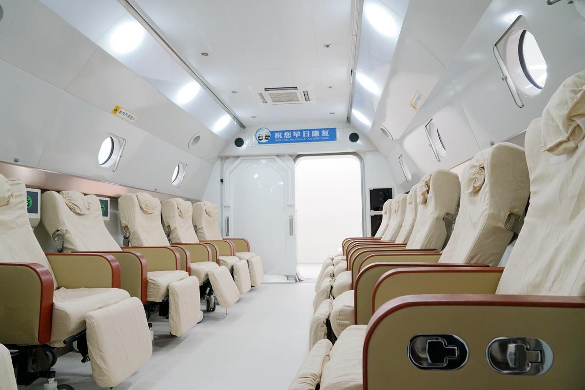 高压氧舱舱室内该院康复医学科主任王晓红介绍,本次引进的超大型高压氧舱,由大小不同的3个舱组成,共有26个治疗位,“三舱七门”的设计既提供了能让担架、轮椅自由进出的大舱,又有独立的小舱,满足不同人群的个性化治疗需求。此外,舱体内设有录像监控系统、对讲系统以及各类急救设备,最大程度地为患者的安全保驾护航。