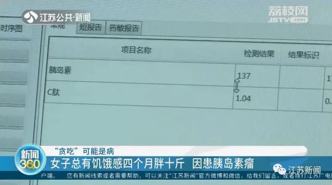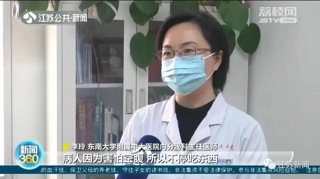 “患者从4个月之前就出现一系列症状,包括头晕、心慌、手抖,经常会觉得肚子饥饿感很明显,而且出现过两次昏迷的情况,促使患者不停去寻找食物,特别是一些高热量的糖果等等,体重也增加了十斤左右。”东南大学附属中大医院内分泌科副主任医师殷汉说。