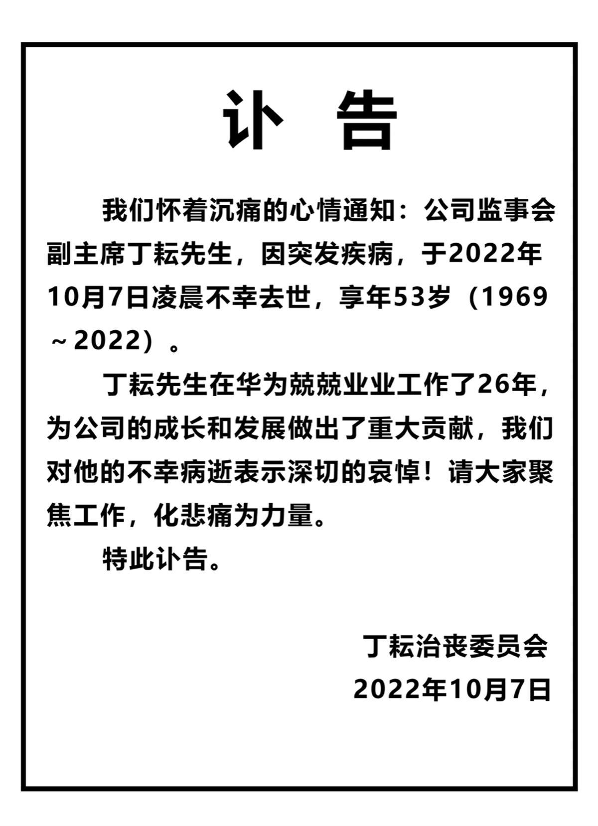 10月7日晚,华为方面发讣告表示,该公司监事会副主席丁耘因突发疾病辞世而别,享年53岁。