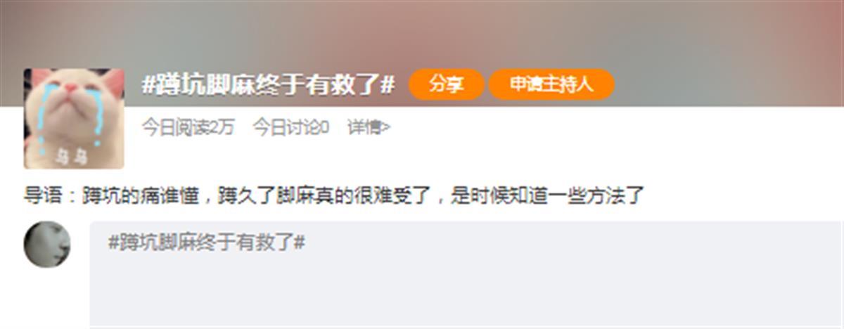 近日,#蹲坑脚麻终于有救了#话题引发热议,不少网友分享了自己“亲测有效”的缓解方法。比如将双肘压在膝盖上;脚后跟踩地,前脚掌微微抬起;双手往下甩动等等。网友说的办法是否可取?如何避免脚麻?10月24日,极目新闻记者采访了江城相关专家。