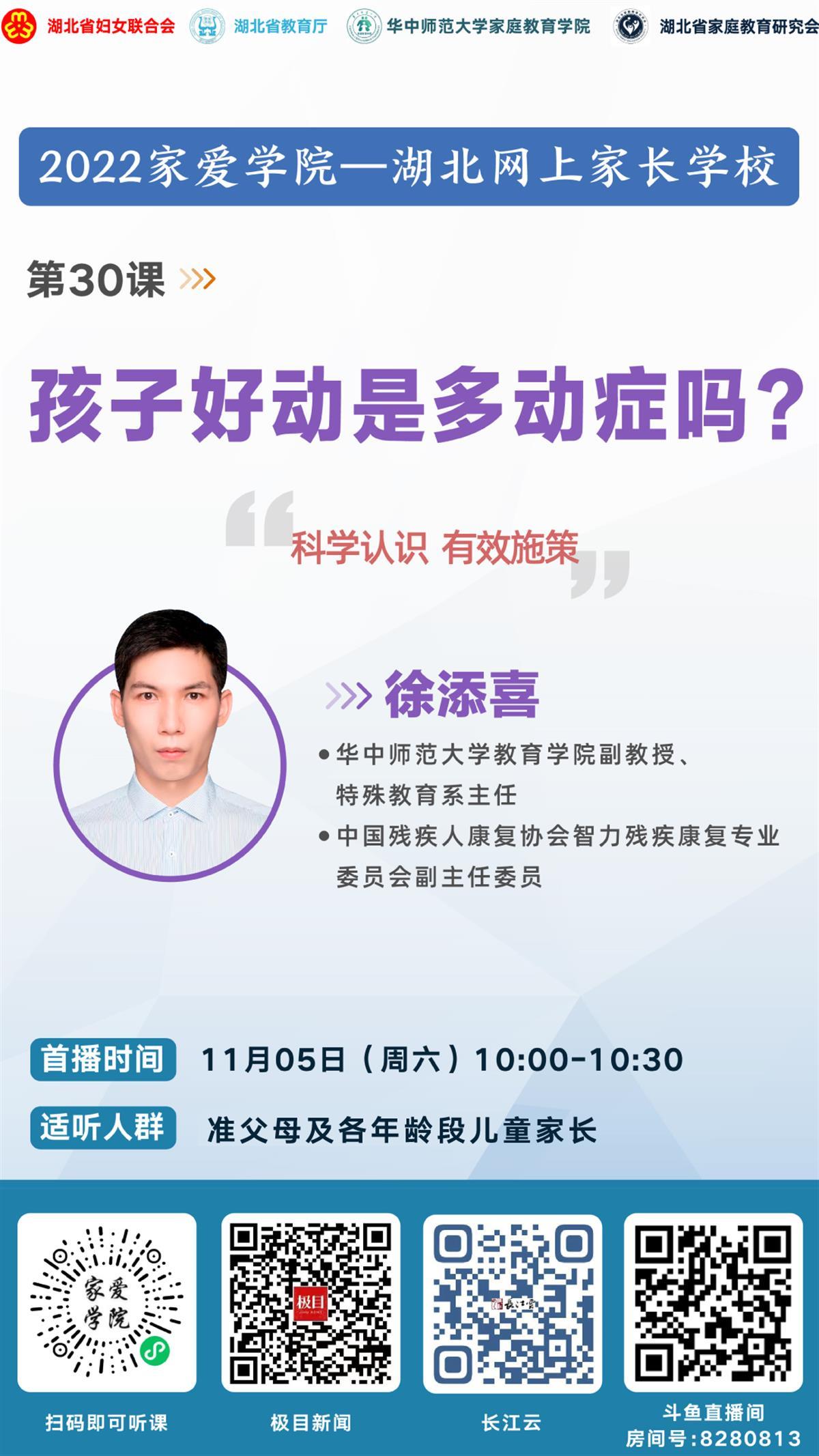什么是多动症?多动症有何异常表现?如何有效应对异常表现?那么,孩子好动,就一定是多动症吗?11月5日上午10时至10时30分,华中师范大学教育学院副教授、特殊教育系主任、中国残疾人康复协会智力残疾康复专业委员会副主任委员徐添喜,与广大家长面对面,带来2022湖北家爱学院第30课《孩子好动是多动症吗》。