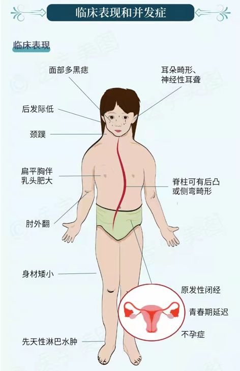 “这个病的主要临床特点为身矮,生殖器与第二性征不发育,身高一般低于150cm。”梁向荣说,躯体特征为多痣,眼睑下垂,耳大位低,腭弓高,后发际低,颈短而宽,有颈蹼,胸廓桶状或盾形,乳头间距大,乳房及乳头均不发育,肘外翻,第4或5掌骨或跖骨短,掌纹通关手,下肢淋巴水肿,肾发育畸形,主动脉弓狭窄等。