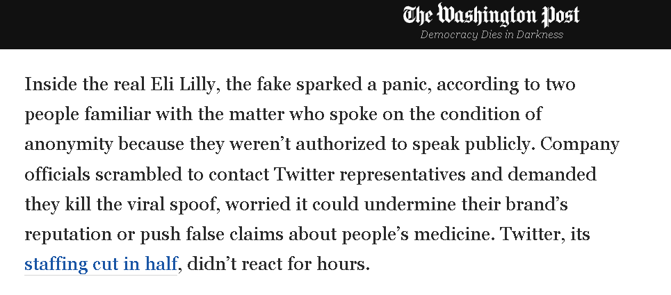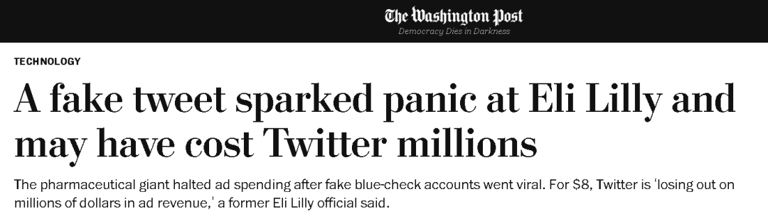 从《华盛顿邮报》的报道来看,礼来公司的人当时直接被这个假账号和假消息给搞崩了心态,一边紧急联系推特要求干掉假账号,一边则慌忙地四处辟谣。可由于推特本身正在经历大裁员,礼来公司一度有几个小时都没有联系上推特的人。