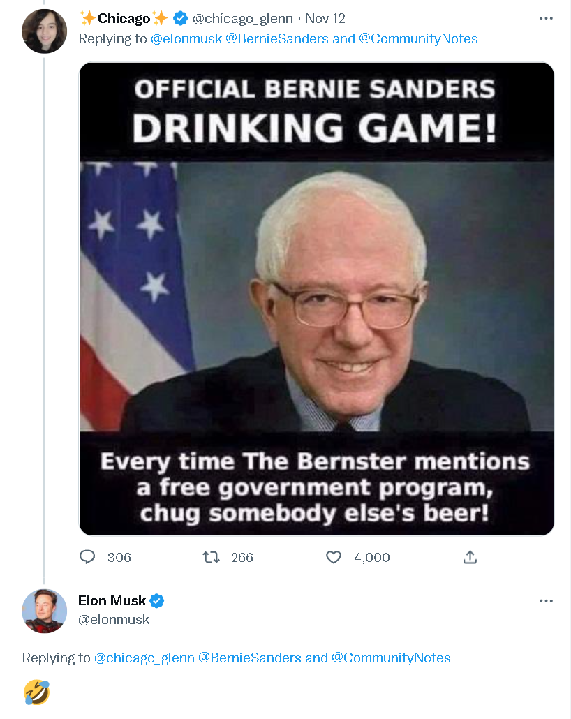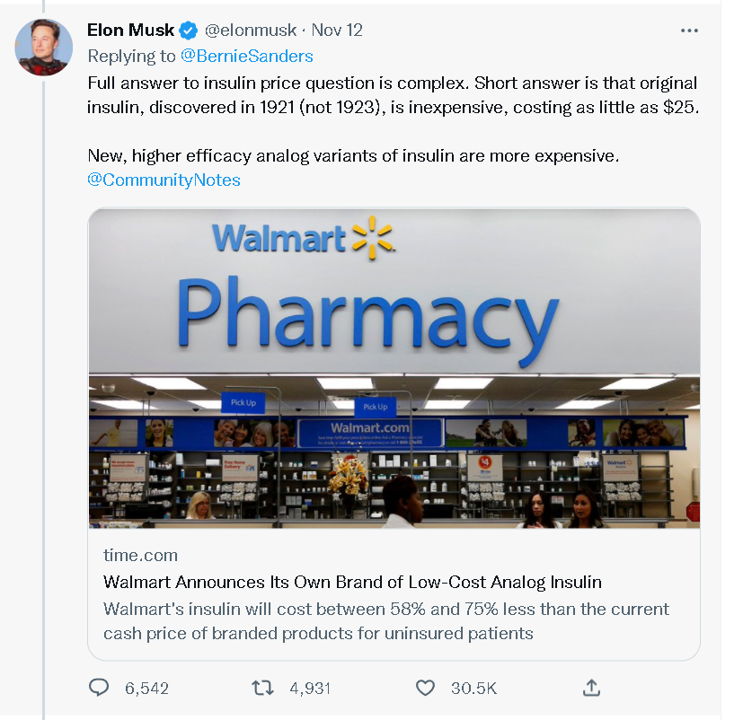不过,这次马斯克倒是迅速在桑德斯的帖文下冒了出来。他一边为礼来公司辩护,称虽然原始的胰岛素仍然挺便宜的,只要25美元,但更高效好用的胰岛素就会更昂贵;一边则转发了一则嘲笑桑德斯又说胡话的帖文……
