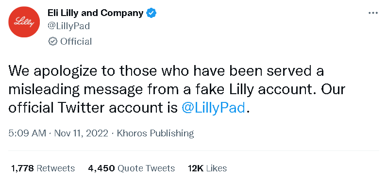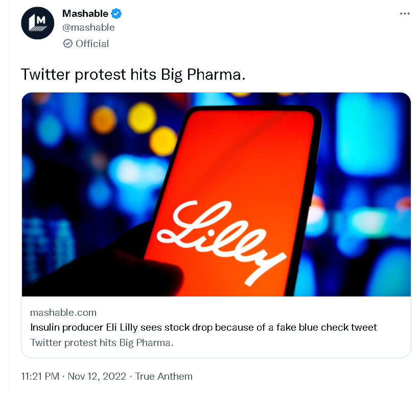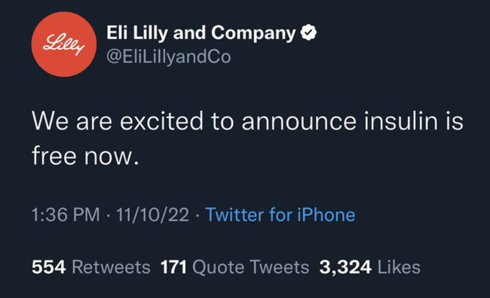 可尴尬的是,当推特的付费认证服务正式上线后,一大波假账号还是如美国媒体所担心的那样喷涌而出,其中就包括耿直哥在文章开头提到的那一幕:一个被推特的蓝标认证为礼来公司的账号,于美国当地时间11月10日下午1点36分发布了一则帖文,其内容是“我们兴奋宣布,胰岛素现在免费啦”。