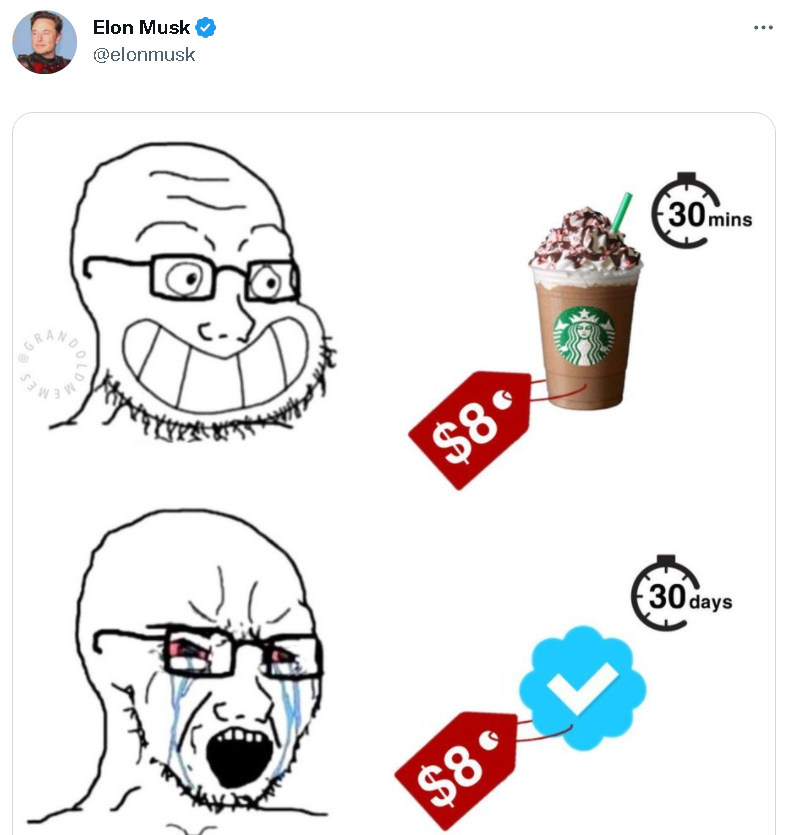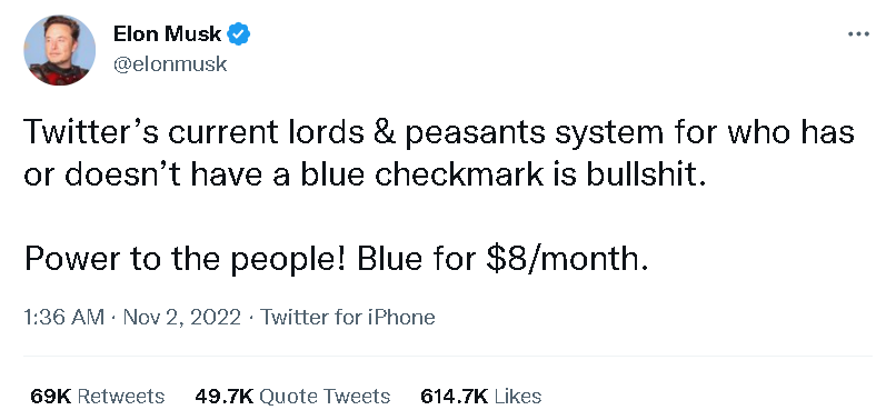 不仅如此,马斯克当时还宣称,他之所以要推广这个只要付费就可以获得的蓝标认证服务,是为了打破之前推特那种将人们分成“贵族和农民”的封建式的认证系统,让更多普通人也可以获得这种之前只有精英们才可以获得的特权。