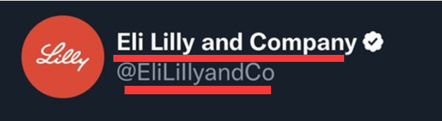 不过,客观地说,这个假账号之所以被很多人当成了真账号,除了有蓝标认证,也是因为仿冒者的账号ID(@EliLillyandCo)与礼来公司的全名完全一致,不像有的假账号,虽然冒充了别人的名字,但账号ID却会露出马脚。