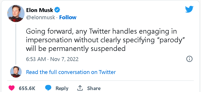 然而,很多美国主流媒体却在这个功能上线前却不断撰文警告说,这种任何人都可以获得的付费认证服务,很可能会被别有用心的人滥用,仿冒他人制造假消息。但马斯克似乎并没有对他的付费认证服务进行调整,只是发帖表示,如果他发现有账号仿冒他人,而且如果这个账号不说明自己是仿冒账号的话,他就会将其永久封号。