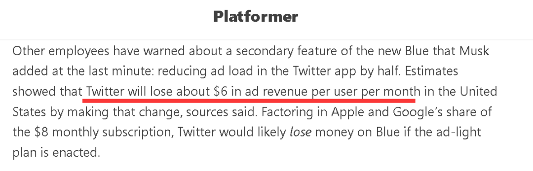 至于为何收取7.99美元的费用,从这些美国媒体的介绍来看,是因为马斯克还想给这些付费用户减少广告的呈现,而且是直接减半,好让他们用得更舒心。但公司内部一计算发现,这么做可能会导致损失——如果平摊在每个用户身上——是6美元,于是便有了这个7.99美元的费用。