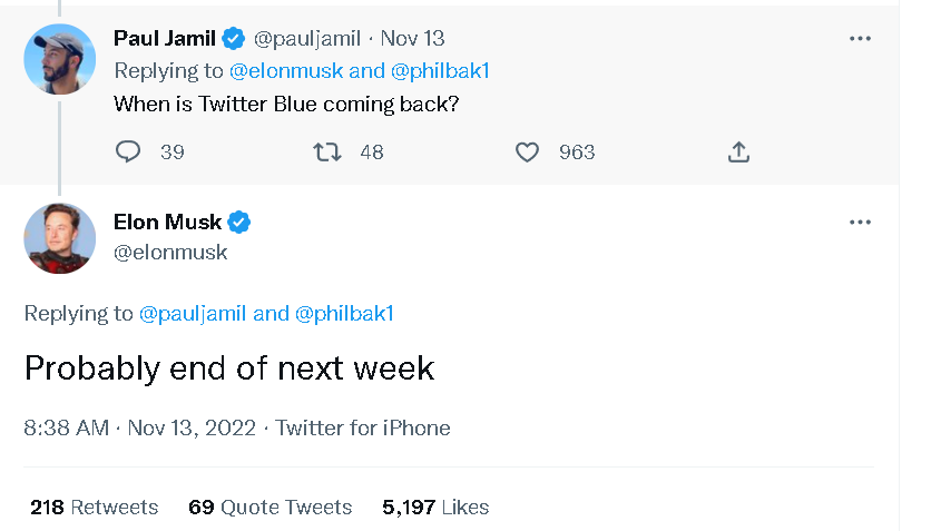 推特方面也因为此事,以及冒充其他公司(比如百事公司、任天堂公司)和名人(比如美国总统拜登和NBA球星詹姆斯)的假账号出现井喷的窘境,不得不暂停付费认证,并封杀了一大批这类账号。但马斯克本人表示,这个服务本周末就会重新上线。
