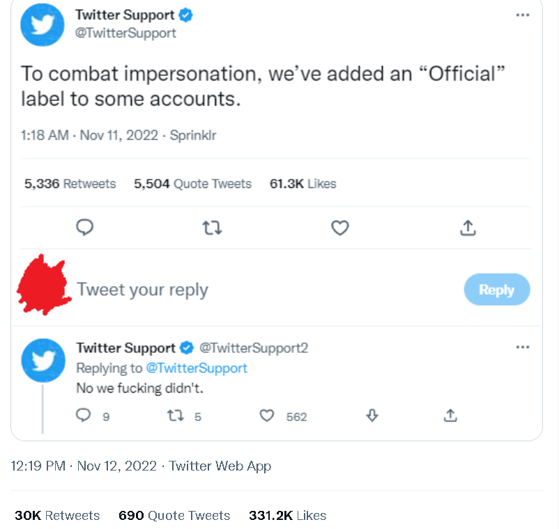 这里还有一个很有意思的细节,就是在礼来公司的事件发生后没多久,推特的客服账号曾一度发帖表示为了应对仿冒账号的问题,推特会在蓝标的基础上再增加一个“官方”的标签。可就在这个帖文的评论区里,一个高仿推特客服的账号却发帖讽刺说:不,我们特么根本没有。