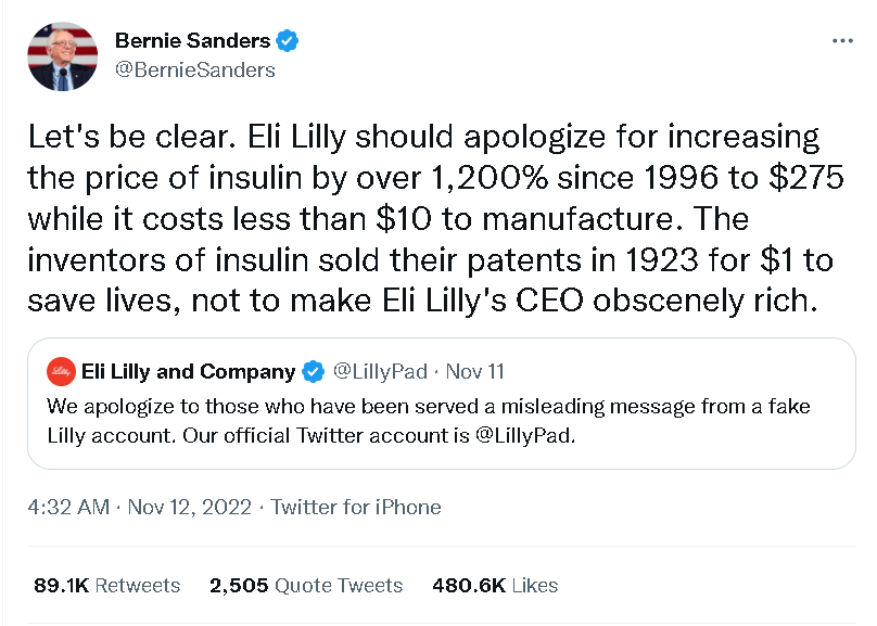 属于民主党阵营的美国知名“左翼”政客、常被打上“社会主义者”标签的桑德斯,就在一则关于此事的帖文中怒斥了礼来公司的贪婪,称生产胰岛素的成本不到10美元,可礼来公司自1996年以来却不断给胰岛素涨价,至今已经涨了1200%,到了如今275美元的地步。