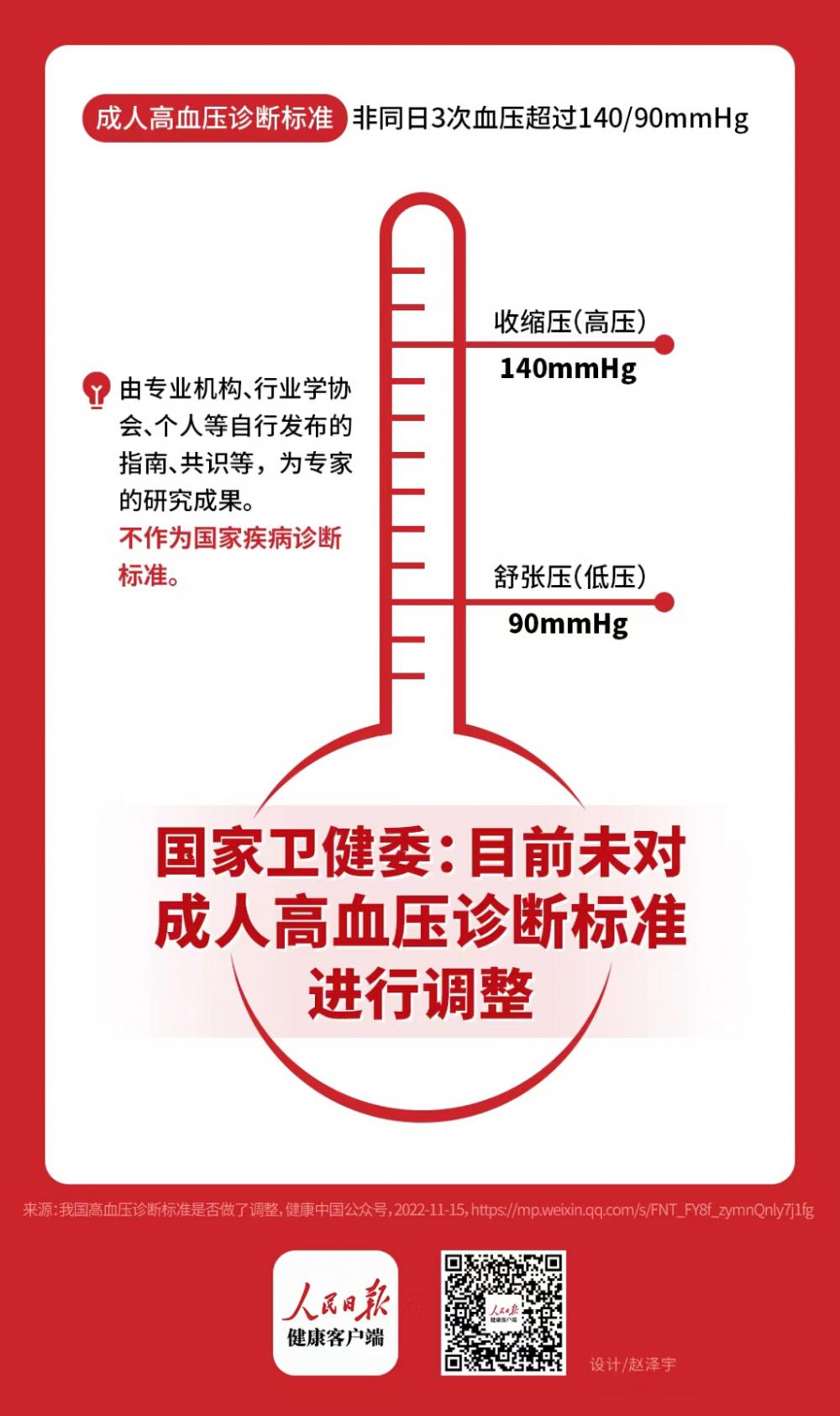 人民日报健康客户端消息,国家卫生健康委员会官方微信公众号“健康中国”明确:目前,国家未对成人高血压诊断标准进行调整,成人高血压的诊断标准仍为非同日3次血压超过140/90mmHg。