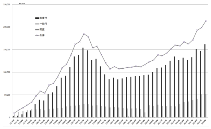 1976-2020年日本汉方药年生产金额变化(单位:百万日元)。图源:日本汉方生药制剂协会总务委员会,《药事工业生产动态统计年报》(2022年3月)