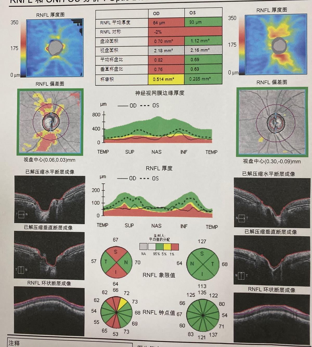 一年后,张女士突然右眼胀痛,头痛,视力急剧下降,到当地医院检查后确诊为急性闭角型青光眼发作。随后张女士接受了手术治疗,并持续点药,可右眼视力再也恢复不到正常了。现在张女士右眼视力不到0.1,眼底视盘苍白,视神经OCT显示神经纤维层明显变薄。