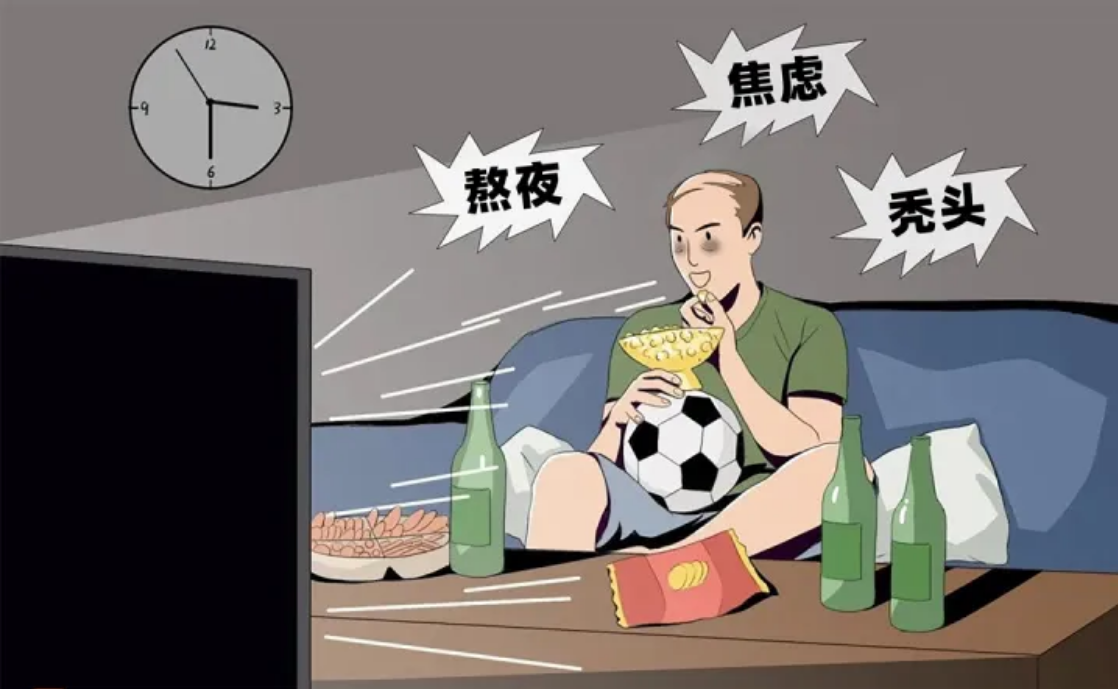 比赛结束难以入睡,还与食物因素关系密切。大赛之前囤功能饮料与咖啡,观赛犯困时来两口,已经成为林强看球的标准动作。“近两年精力有些跟不上,不喝点饮料提神,很容易犯困。”林强说。对此,李翠鸾表示,咖啡等兴奋性饮料并不像机械的开关那样可以很快起效,多数时候恰恰是比赛结束,提神效果才更明显,因此建议夜间看球谨慎饮用功能饮料。“另外,球迷很可能不会只喝饮料,大部分是边吃边喝,饮食过饱也会导致难以入睡。”