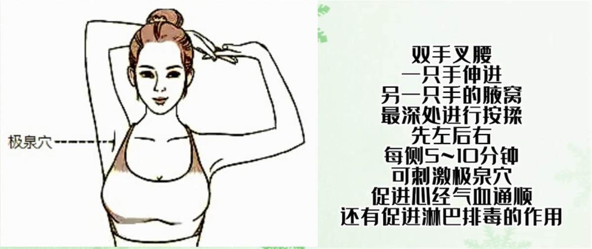 双手叉腰,一只手伸进另一只手的腋窝最深处进行按揉。先左后右,每侧5~10分钟。可刺激极泉穴,促进心经气血通顺,还有促进淋巴排毒的作用。
