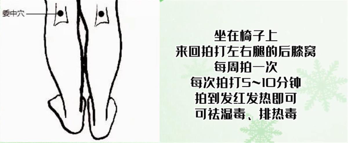 坐在椅子上,来回拍打左右腿的后膝窝。每周拍一次,每次拍打5~10分钟,拍到发红发热即可。可祛湿毒、排热毒。