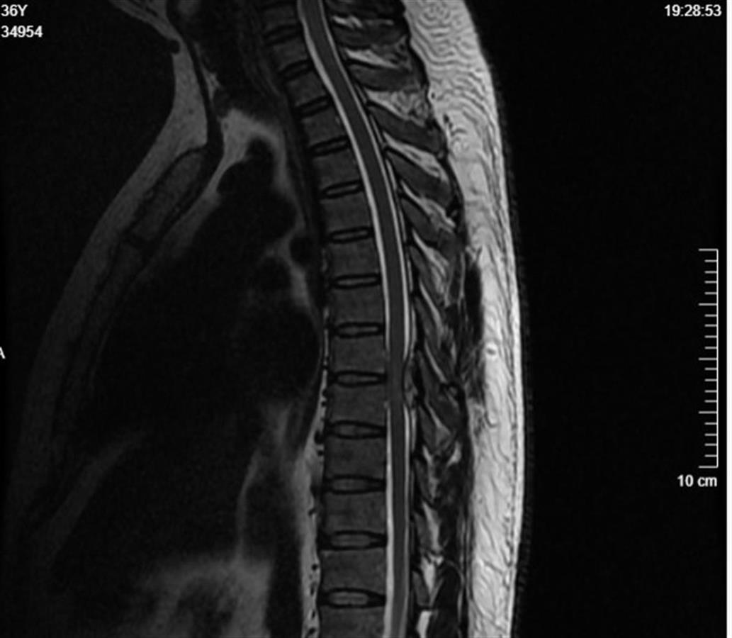 武汉市第四医院脊柱外科医生接诊后,对张先生进行了详细的检查,磁共振检查结果显示,张先生的脊柱胸椎段有异常影像改变,椎管狭窄导致脊髓神经受到压迫,已经出现了缺血变性;进一步检查发现张先生的尿酸值超标,结合脚踝胀痛等迹象,医生判断他腰部及下肢麻木是由痛风性炎症所致,即痛风石“长”在脊柱上了。